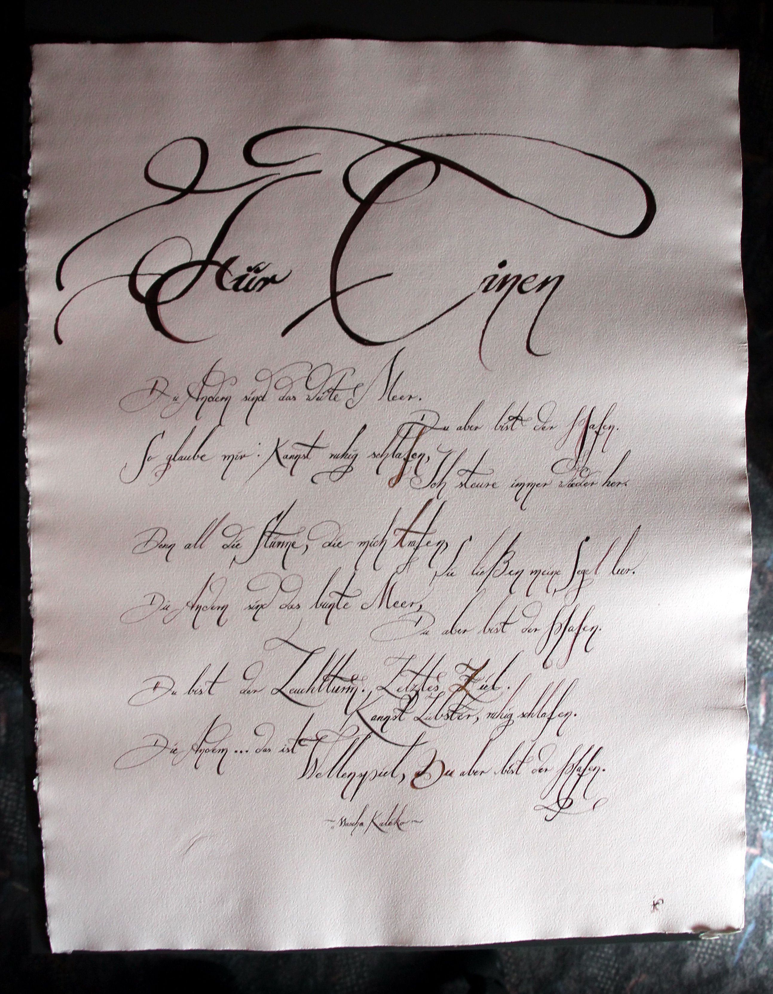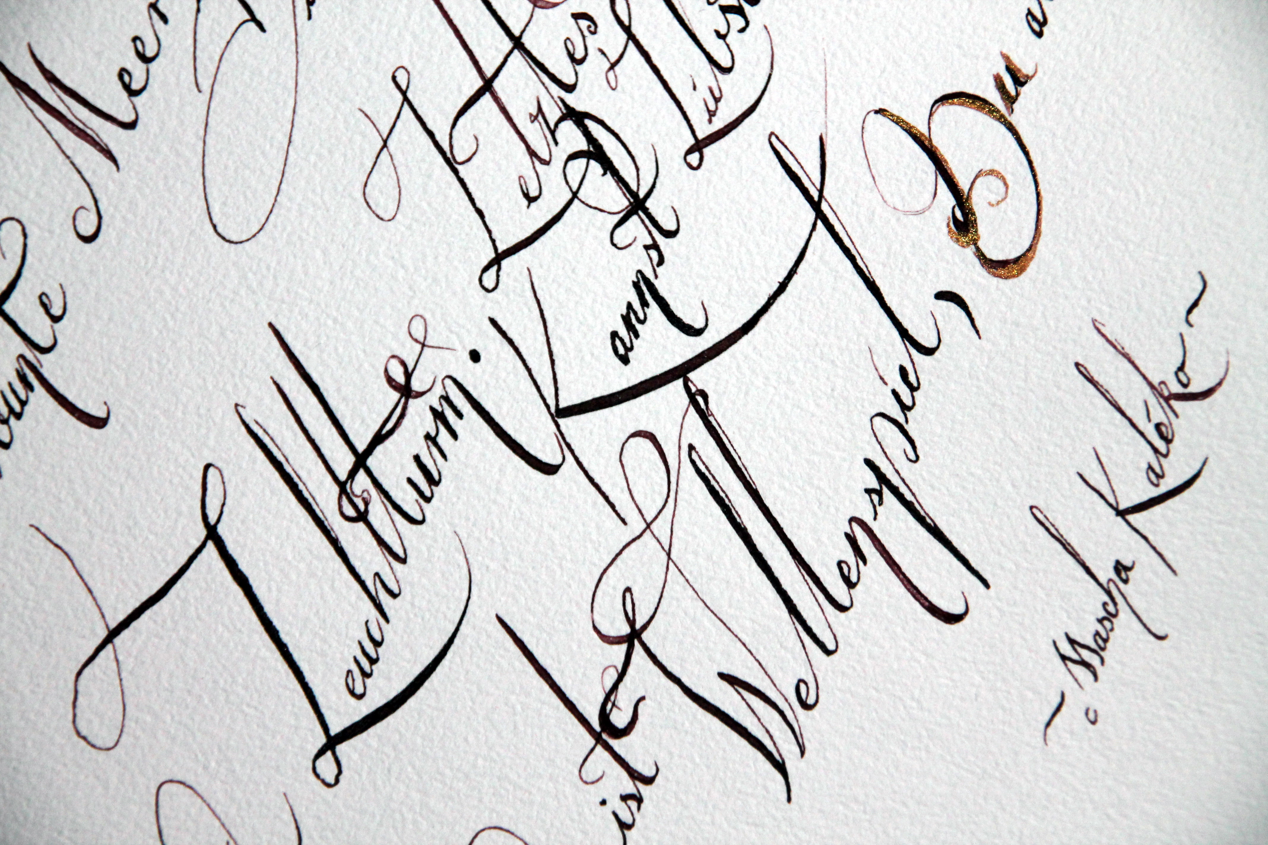 freie Kalligraphie in Anlehnung an die Anglaise, Tusche auf Handgeschöpften Büttenpapier, Kirschblüten-