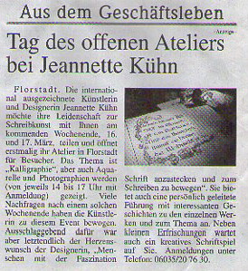Die international ausgezeichnete Künstler - und Designerin Jeannette Kühn, auch bekannt unter Ihrem Mädchen- und Künstlernamen J. Lehnen, möchte Ihre Leidenschaft zur Schreibkunst mit Ihnen am Wochenende des 16. und 17.03. teilen und öffnet erstmalig Ihr Atelier in Florstadt für Besucher. Das Thema ist „Kalligraphie“, aber auch Aquarelle und Photographien werden (von jeweils 14.00 - 17.00h mit Anmeldung), gezeigt.
