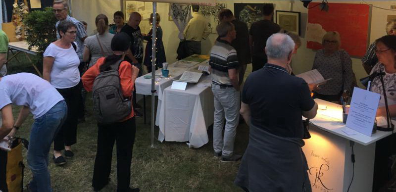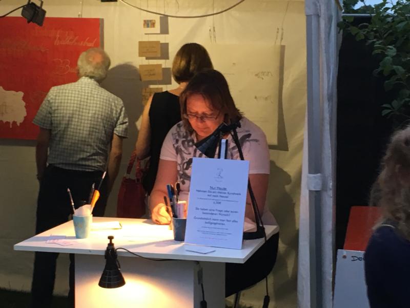 Man erzählte mir von dem Konzept des Kulturabends, in dem mehrere Künstler gleichzeitig das Publikum an einem Abend begeistern.Das Ganze in der einmaligen Atmosphäre des Fronhofs. Man fragte mich gleichzeitig, ob ich Lust und Zeit hätte.Ich dachte mir: "Versuchs einfach mal".Mir wurde ein großes Galeriezelt gegenüber der Bühne bereitgestellt. Dort gestaltete ich eine Vernissage mit ausgewählten Kunstwerken auf die Beine, die zum Thema des Bühnenprogramms passten. Bei den Werken war es mir wichtig, mich nicht nur auf Papier zu beschränken.Ich wollte den Gästen zeigen, wie vielfältig Kalligraphie sein kann.Wer hätte gedacht, dass der Andrang so riesig werden würde? Gleichzeitig gab es eine Live Aktion von mir, an dem jeder Besucher eine kleine Kalligraphie von mir erhielt. An meinem Stehpult kalligraphierte ich live den Vornamen der Gäste in eine Mini-Schultüte, wer denn wollte. Diese Schultüte für Erwachsene, stand unter dem Motto: Bildung Macht glücklich - Wert Schätze die Kunst Freiheit. Auch die Tüte war stimmig zum Bühnenprogramm angepaßt. Um es kurz zu machen: Der Andrang war so immens, das ich es in der gegebenen Zeit nicht schaffte, allen Gästen eine Tüte zu überreichen. Wer wollte, hatte aber dann die Möglichkeit, eine bei mir nach zu fordern. So waren alle zufrieden. Auch Fragen stellen und über die Schulter schauen war erwünscht und wurde sehr gut genutzt.